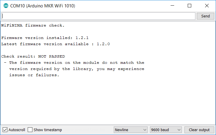 After uploading the sketch, open the Serial Monitor to check the version of the firmware loaded on your board. Don't worry if you see "Check result: NOT PASSED", just check that the firmware version installed is the one you selected in the FirmwareUpdater window.