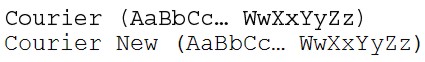 Common monospace fonts are Courier and Courier New. Both of these fonts have the appearance of old typewriter font faces, and are commonly used to display computer code, HTML markup, and other technical content.