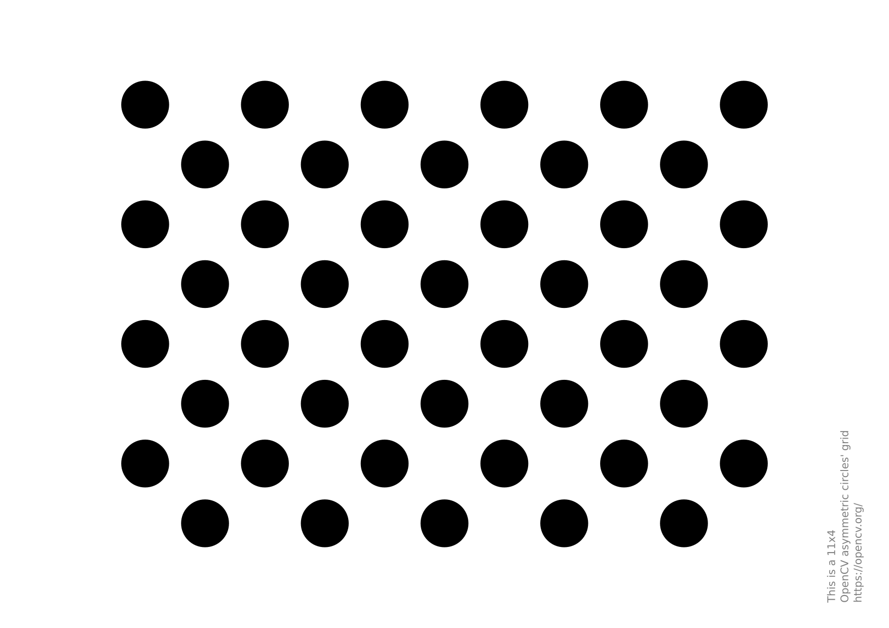 The same works for this asymmetrical circle pattern by setting the input width to 4 and height to 11. This time I've used a live camera feed by specifying its ID ("1") for the input. Here's, how a detected pattern should look: