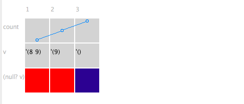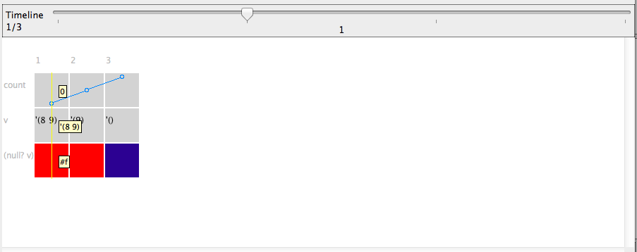 When (same? v) is called for the first time, it always returns true. Aside from the first call, if the current state of v is different from the previous state, the call returns false; otherwise, the value is true. Like (assert pred), only false values are highlighted in red in the timeline.